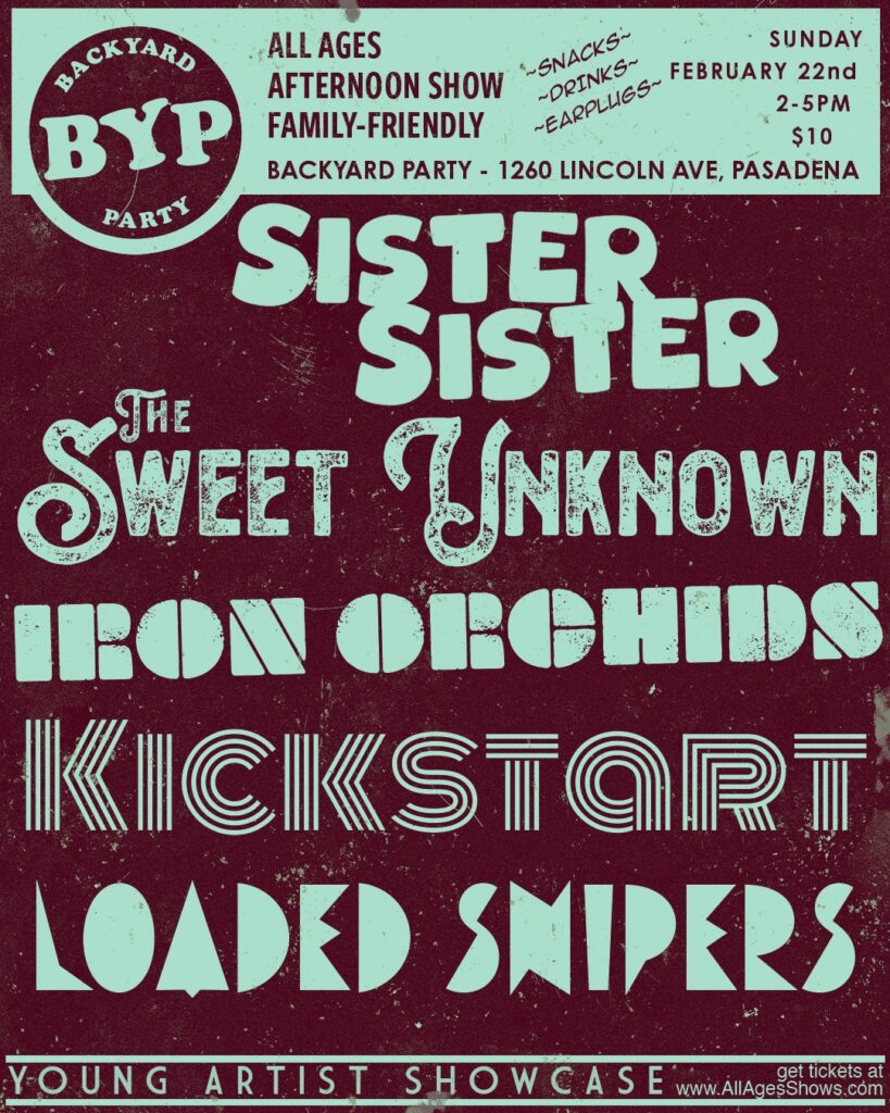 The Young Artist Showcase features live performances from Sister Sister, The Sweet Unknown, Iron Orchids, Kickstart, and Loaded Snipers. These rising bands are bringing fresh energy, original sound, and serious talent to the stage.